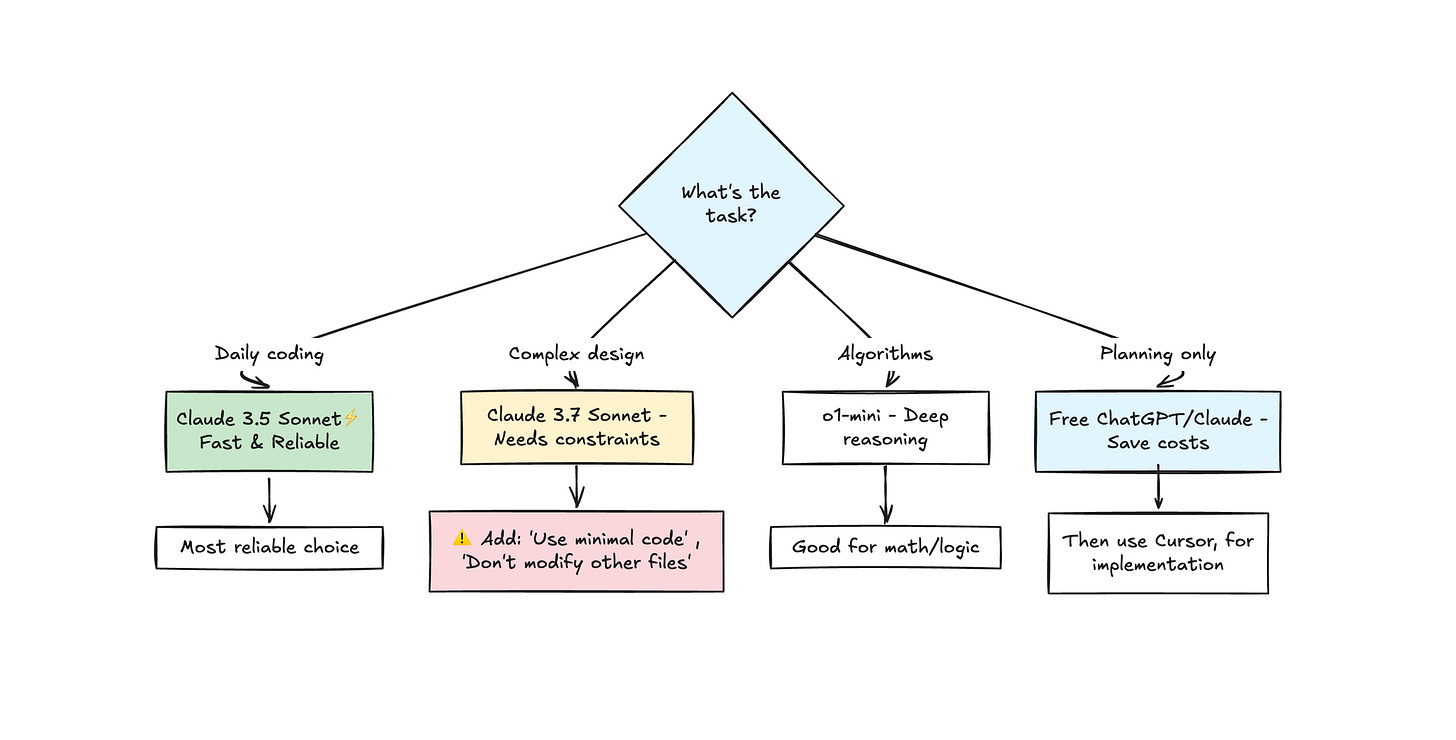 avoid Claude Opus in Cursor (too expensive, will hit limits immediately) and GPT-3.5 (significant quality drop). Auto mode for critical code proves unpredictable due to model switching.