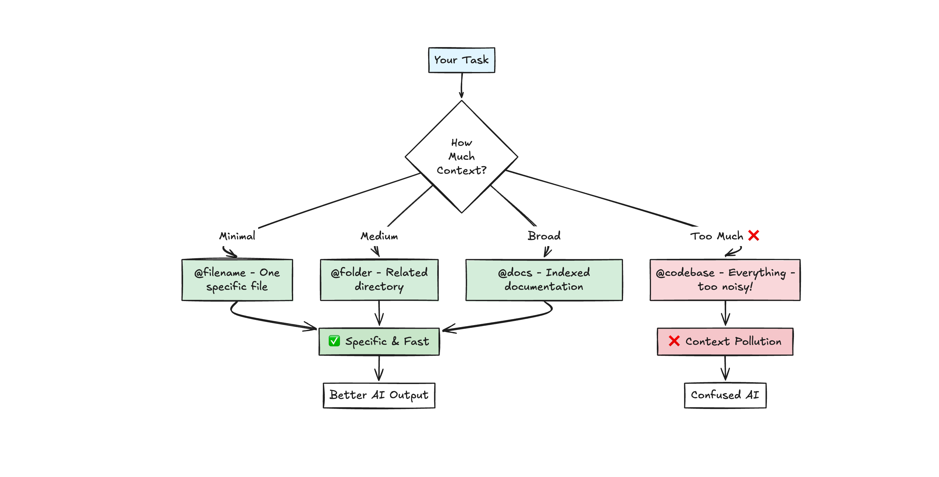 the critical insight: only include files directly relevant to the current task. Broad context makes AI a generalist when you need a specialist