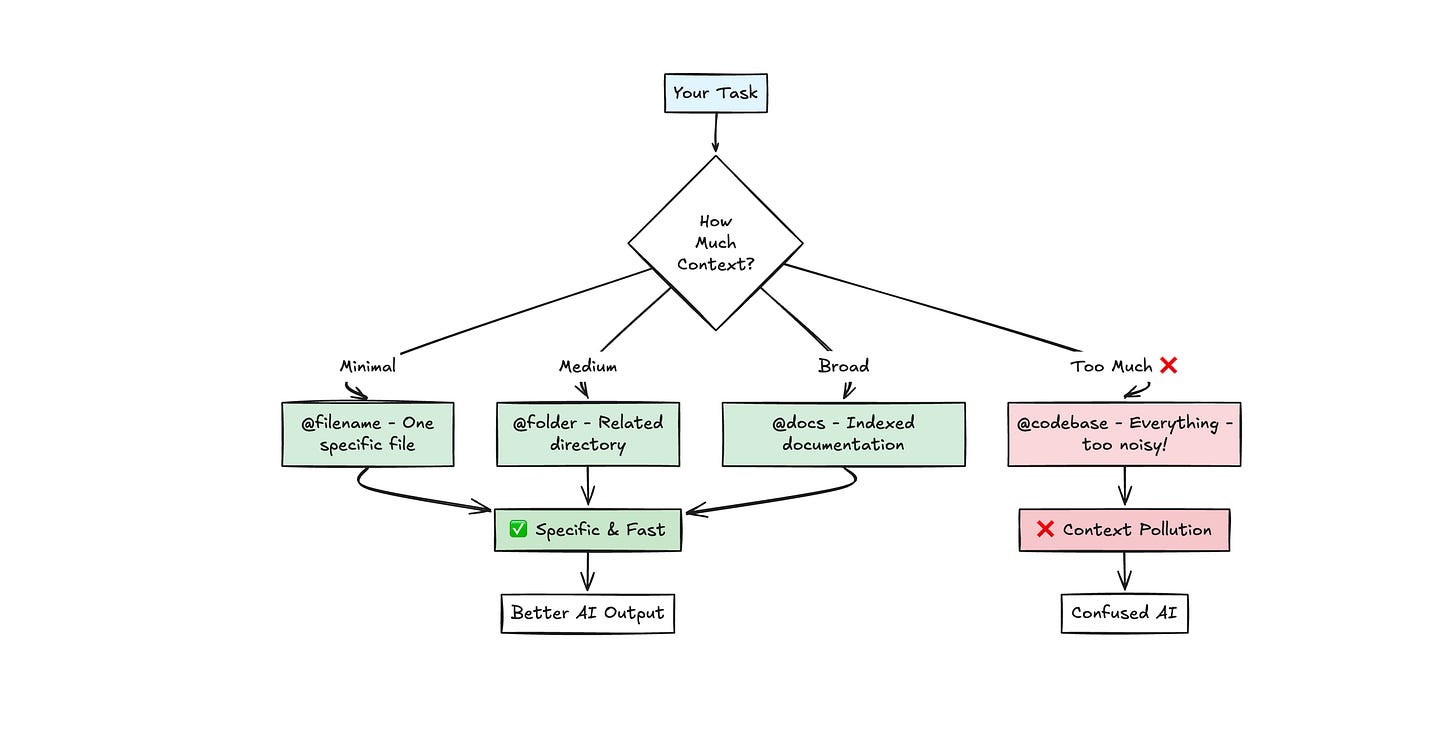 start with minimal information and add context as needed rather than overwhelming AI upfront. one file reference is often better than ten.